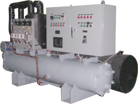 船用冷(熱)水機(jī)組作為船舶中央空調(diào)系統(tǒng)的冷(熱)源,提供系統(tǒng)循環(huán)冷(熱)媒水。機(jī)組主要由壓縮機(jī)、冷凝器、干式蒸發(fā)器、電控箱、閥件及儀表等組裝成一體,與風(fēng)機(jī)盤(pán)管、間接式空調(diào)器組合成空調(diào)系統(tǒng)使用。